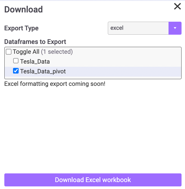 If you select Excel, you can then decide which dataframes you want to include as tabs in the same workbook (this code can be tricky to write yourself).