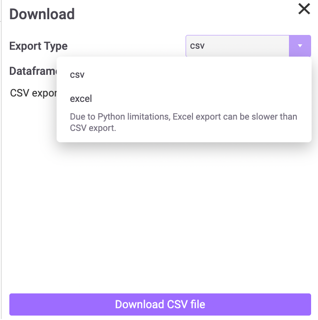 Mito also provides a simple interface to export any dataframe without needing to write any code. Here you can see the export menu, where you can select between CSV or Excel: