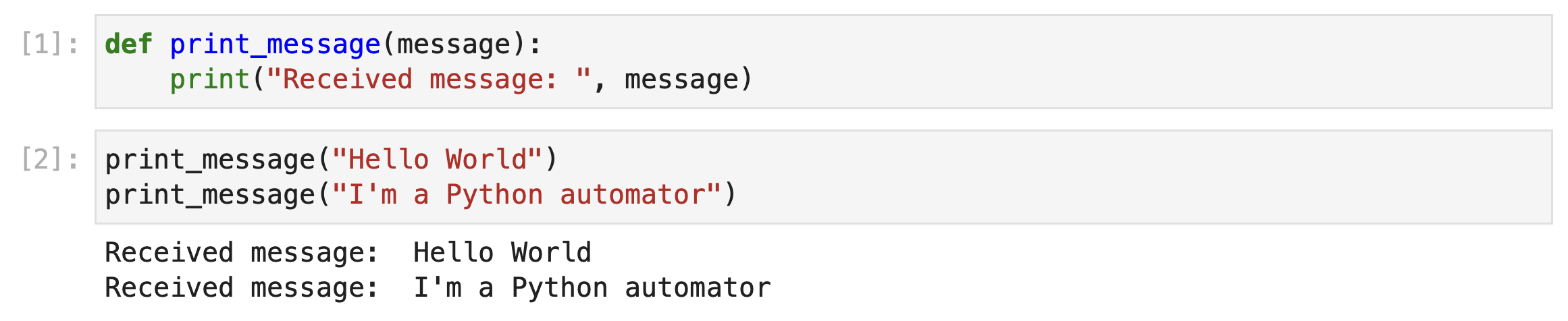 print("Received message: ", "Hello World")A slightly more complicated function